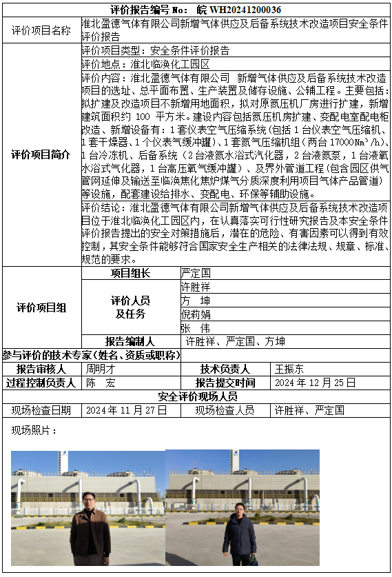 淮北盈德氣體有限公司新增氣體供應及后備系統(tǒng)技術改造項目安全條件評價報告