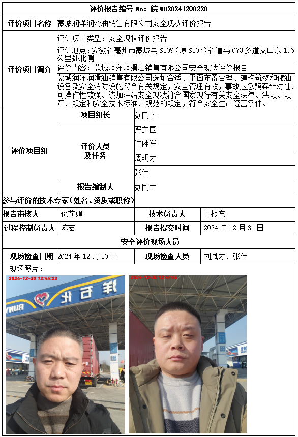 蒙城潤(rùn)洋潤(rùn)滑油銷售有限公司安全現(xiàn)狀評(píng)價(jià)報(bào)告
