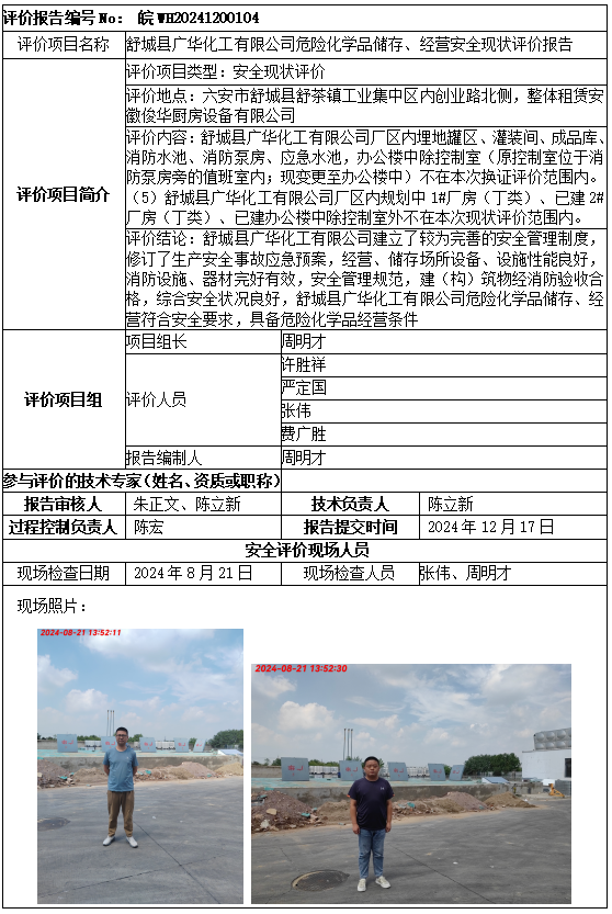 舒城縣廣華化工有限公司危險化學(xué)品儲存、經(jīng)營安全現(xiàn)狀評價報告