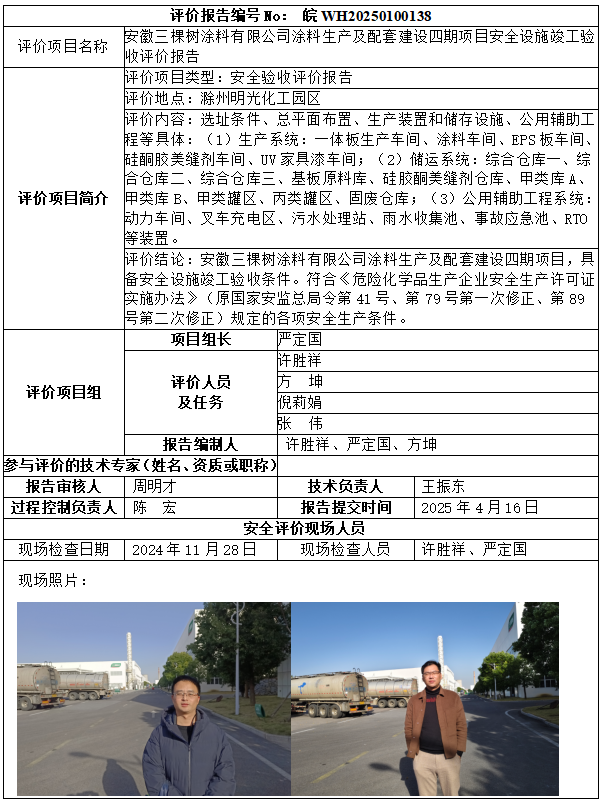 安徽三棵樹涂料有限公司涂料生產及配套建設四期項目安全設施竣工驗收評價報告
