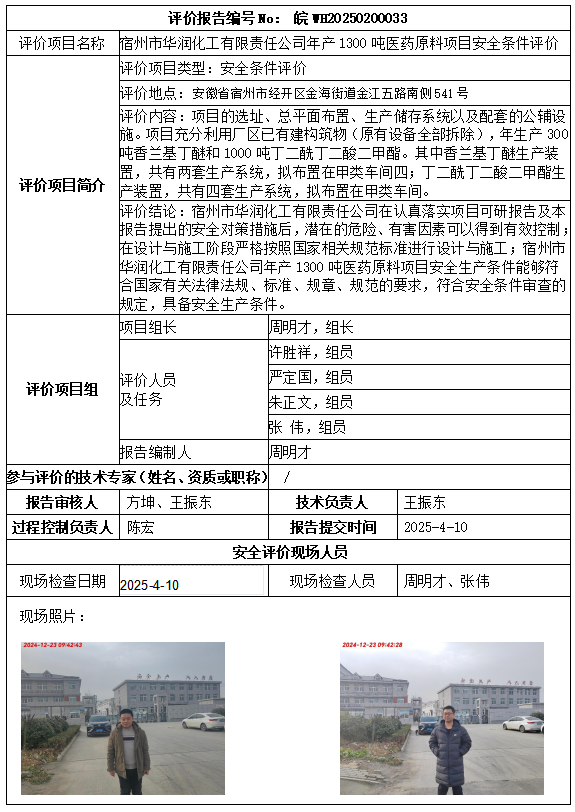 宿州市華潤化工有限責任公司年產(chǎn)1300噸醫(yī)藥原料項目安全條件評價