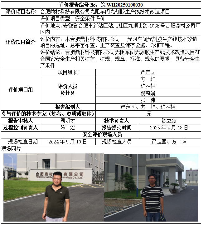 合肥鼎材科技有限公司光阻車間光刻膠生產(chǎn)線技術(shù)改造項(xiàng)目安全條件評價(jià)