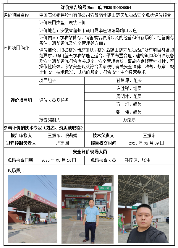 中國(guó)石化銷售股份有限公司安徽宿州碭山藍(lán)天加油站安全現(xiàn)狀評(píng)價(jià)報(bào)告