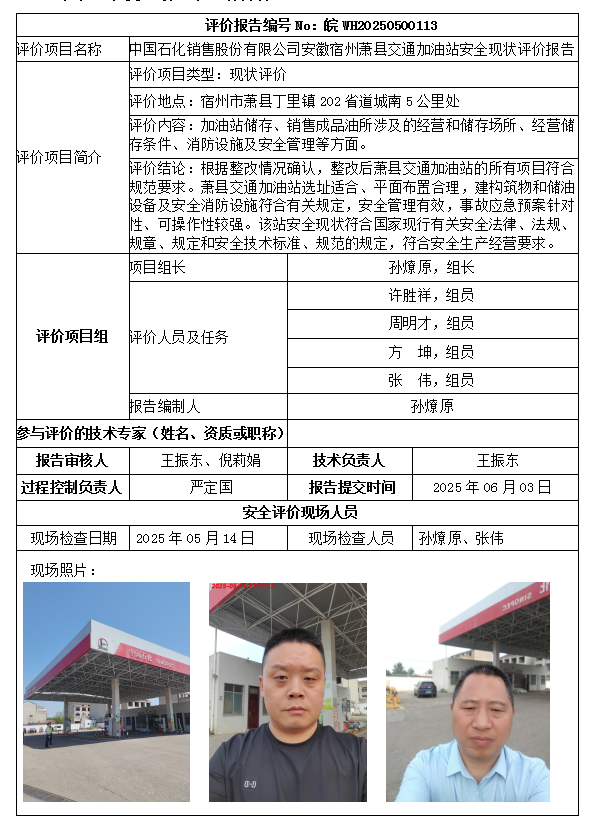 中國(guó)石化銷(xiāo)售股份有限公司安徽宿州蕭縣交通加油站安全現(xiàn)狀評(píng)價(jià)報(bào)告