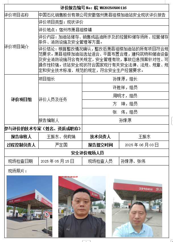 中國石化銷售股份有限公司安徽宿州蕭縣祖樓加油站安全現(xiàn)狀評價報告