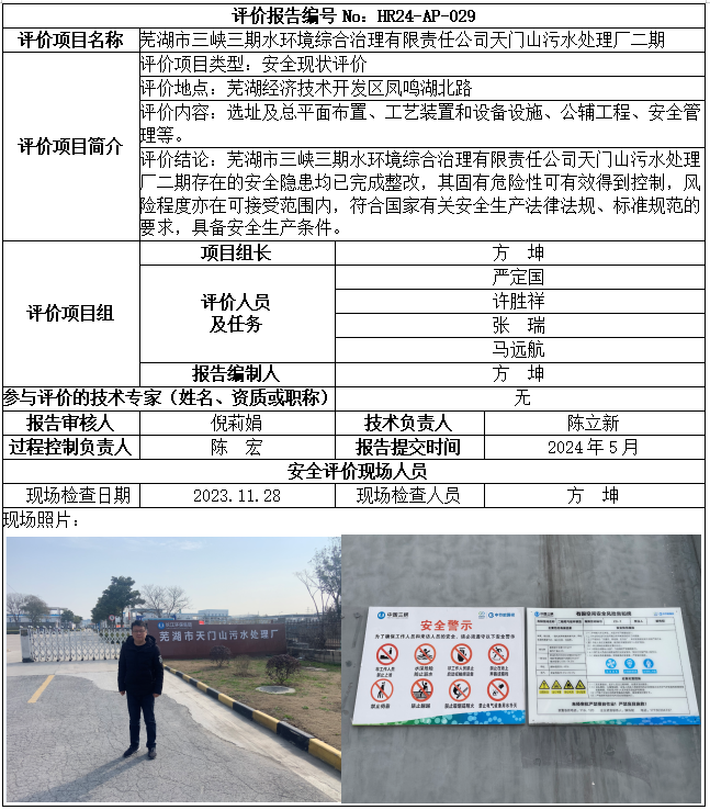 蕪湖市三峽三期水環(huán)境綜合治理有限責(zé)任公司天門山污水處理廠二期安全現(xiàn)狀評(píng)價(jià)