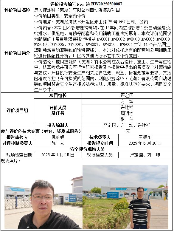 龐貝捷涂料(蕪湖)有限公司自動(dòng)灌裝線項(xiàng)目安全預(yù)評價(jià)