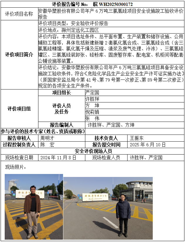 安徽華塑股份有限公司年產(chǎn)6萬噸三氯氫硅項目安全設(shè)施竣工驗收評價報告