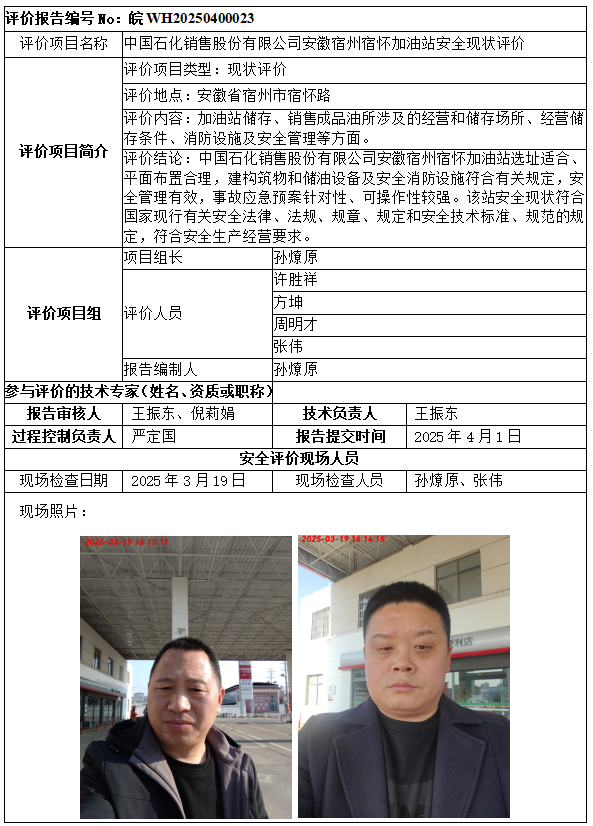 中國石化銷售股份有限公司安徽宿州宿懷加油站安全現(xiàn)狀評價