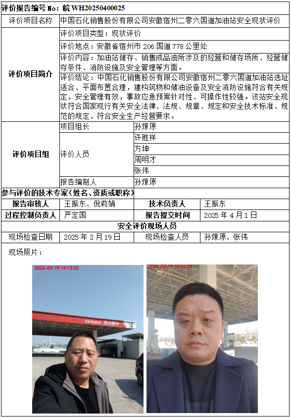 中國石化銷售股份有限公司安徽宿州二零六國道加油站安全現(xiàn)狀評價