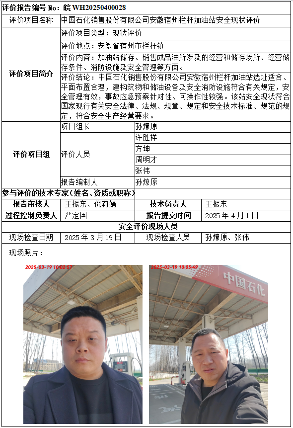 中國(guó)石化銷(xiāo)售股份有限公司安徽宿州欄桿加油站安全現(xiàn)狀評(píng)價(jià)