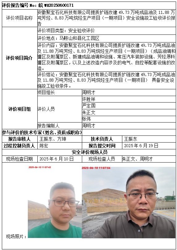 安徽聚寶石化科技有限公司提質擴鏈改建49.73萬噸成品油及11.88萬噸芳烴、8.83萬噸烷烴生產(chǎn)項目(一期項目)安全設施竣工驗收評價報告