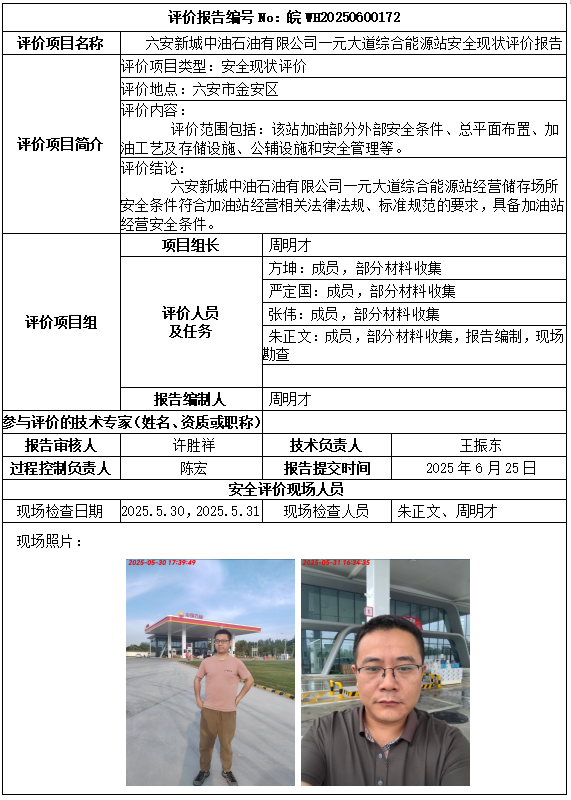 六安新城中油石油有限公司一元大道綜合能源站安全現(xiàn)狀評價報告