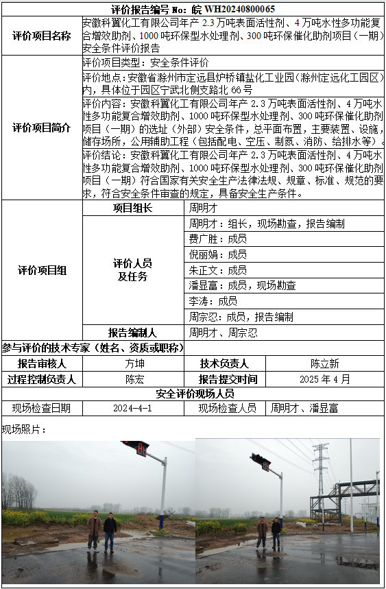 安徽科翼化工有限公司年產(chǎn)2.3萬噸表面活性劑、4萬噸水性多功能復合增效助劑、1000噸環(huán)保型水處理劑、300噸環(huán)保催化助劑項目(一期)安全條件評價報告
