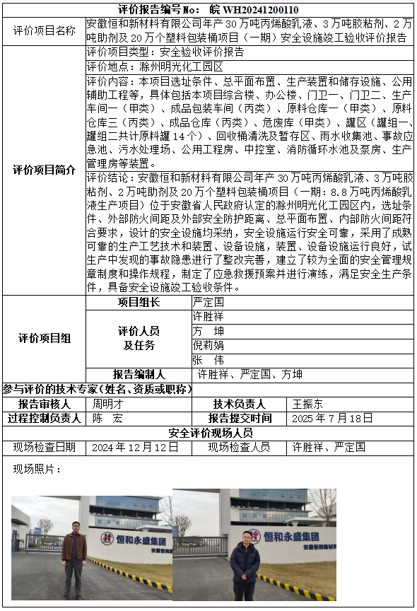 安徽恒和新材料有限公司年產(chǎn)30萬噸丙烯酸乳液、3萬噸膠粘劑、2萬噸助劑及20萬個塑料包裝桶項(xiàng)目(一期)安全設(shè)施竣工驗(yàn)收評價報告