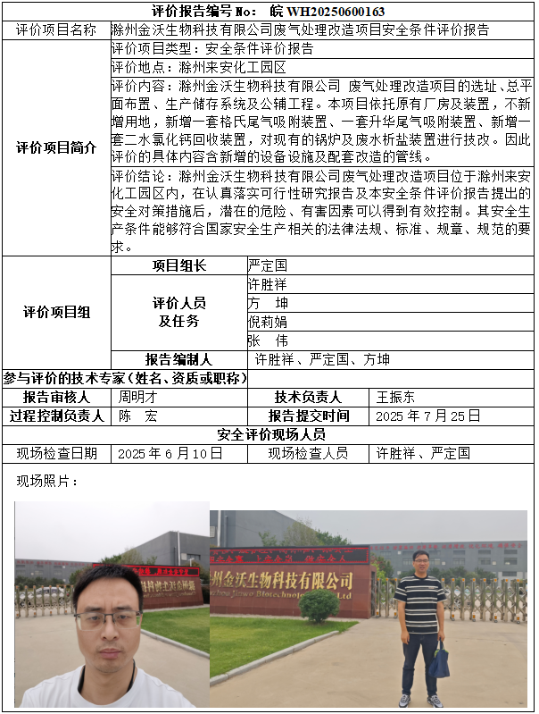 滁州金沃生物科技有限公司廢氣處理改造項(xiàng)目安全條件評(píng)價(jià)報(bào)告