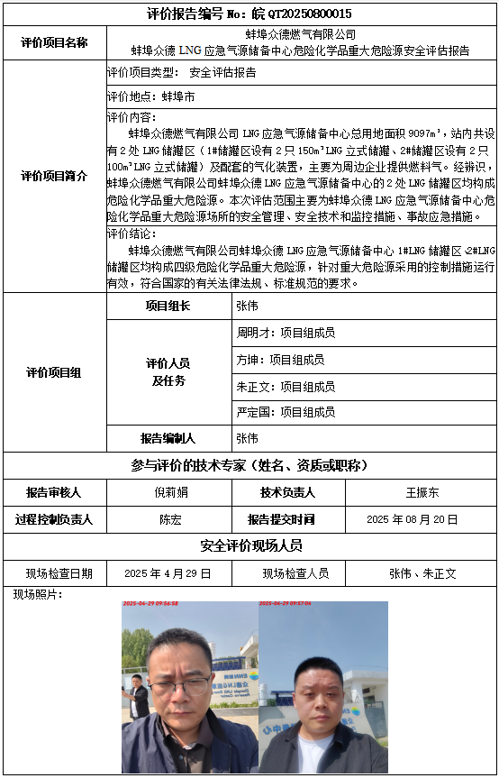 蚌埠眾德燃氣有限公司蚌埠眾德LNG應急氣源儲備中心危險化學品重大危險源安全評估報告