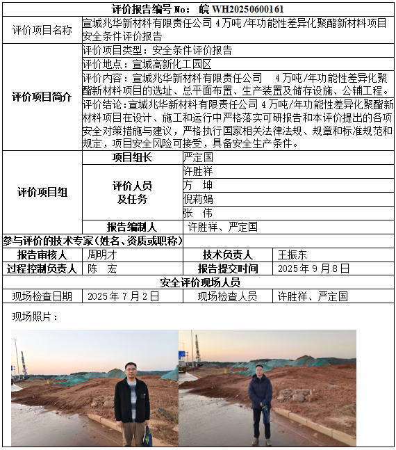 宣城兆華新材料有限責(zé)任公司4萬噸/年功能性差異化聚酯新材料項(xiàng)目 安全條件評(píng)價(jià)報(bào)告
