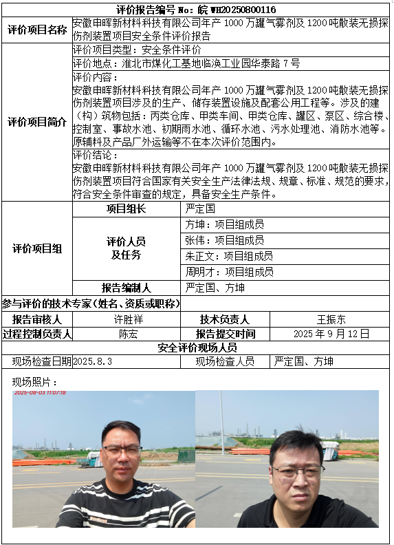 安徽申暉新材料科技有限公司年產(chǎn)1000萬(wàn)罐氣霧劑及1200噸散裝無(wú)損探傷劑裝置項(xiàng)目安全條件評(píng)價(jià)報(bào)告