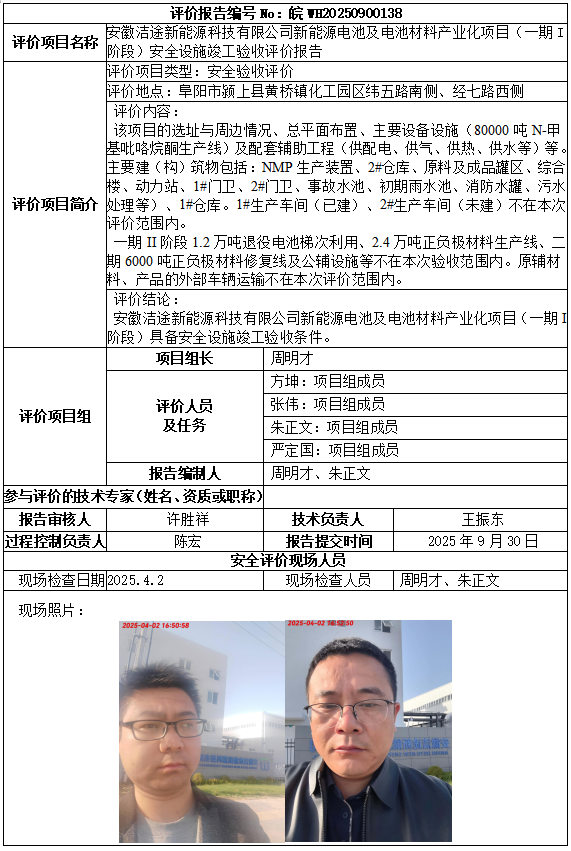 安徽潔途新能源科技有限公司新能源電池及電池材料產(chǎn)業(yè)化項目(一期I階段)安全設(shè)施竣工驗收評價報告