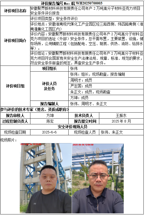安徽聚界新材料科技有限責任公司年產(chǎn)2萬噸高分子材料亞克力項目 安全條件評價報告