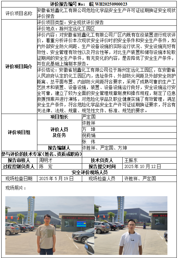 安徽省旭鑫化工有限公司危險化學品安全生產(chǎn)許可證延期換證安全現(xiàn)狀評價報告