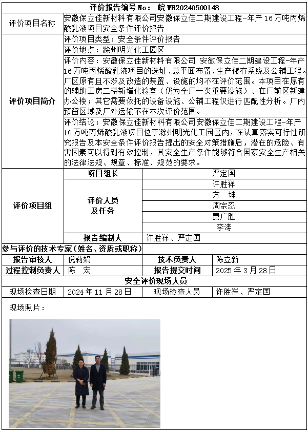 安徽保立佳新材料有限公司安徽保立佳二期建設(shè)工程-年產(chǎn)16萬噸丙烯酸乳液項(xiàng)目安全條件評(píng)價(jià)報(bào)告