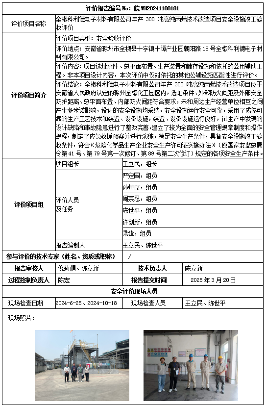 全椒科利德電子材料有限公司年產(chǎn) 300 噸高純丙烯技術(shù)改造項目安全設(shè)施竣工驗收評價