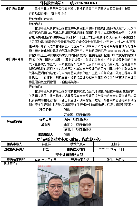 霍邱中勝玩具有限公司醇水轉(zhuǎn)化制取氫混合氣體裝置項目安全預(yù)評價報告