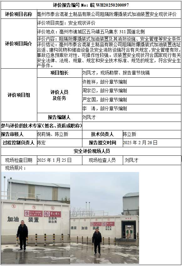 亳州市泰合混凝土制品有限公司阻隔防爆撬裝式加油裝置安全現(xiàn)狀評(píng)價(jià)