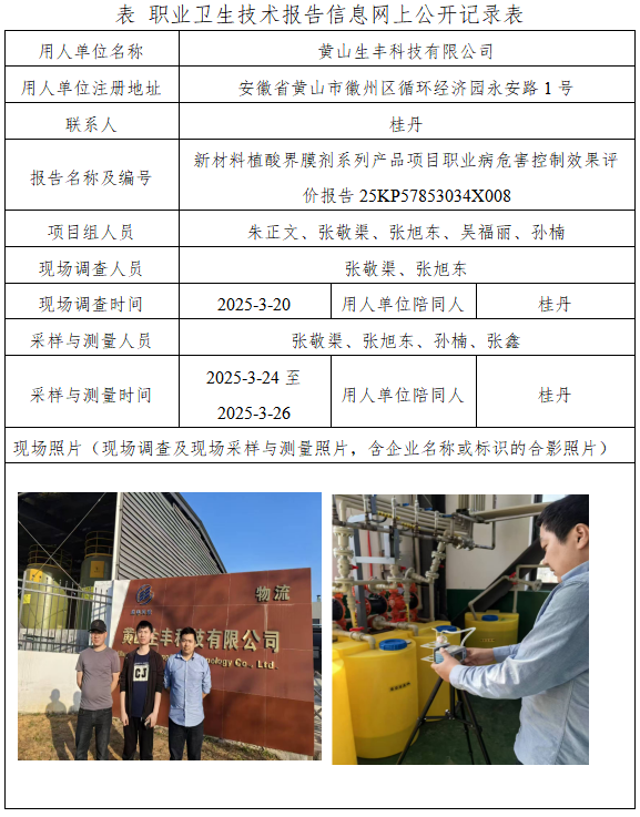 黃山生豐科技有限公司新材料植酸界膜劑系列產品項目職業(yè)病危害控制效果評價報告