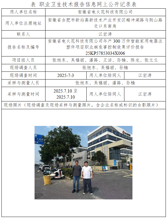 安徽省電火花科技有限公司年產(chǎn)300萬件智能家用電器注塑件項目職業(yè)病危害控制效果評價報告