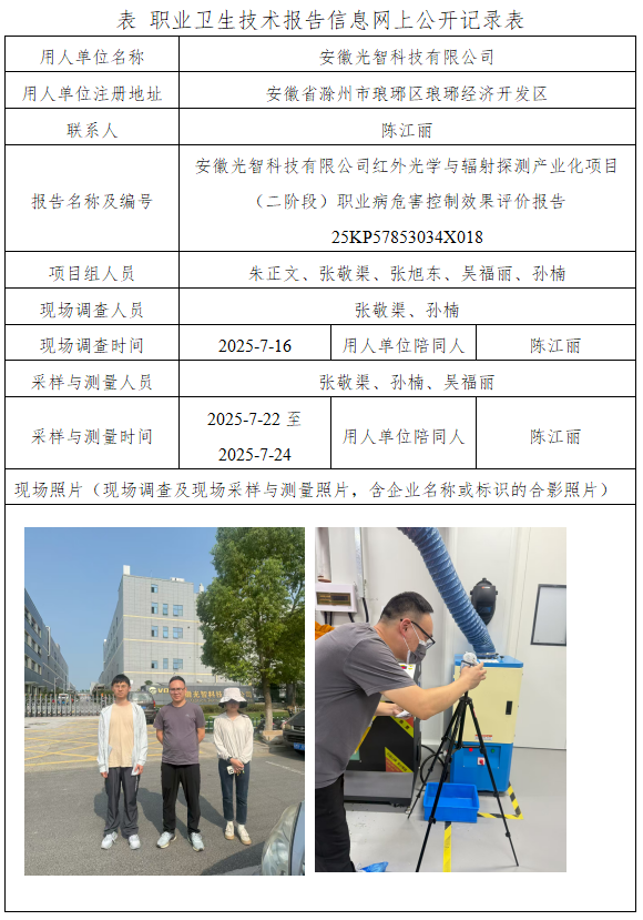 安徽光智科技有限公司紅外光學(xué)與輻射探測產(chǎn)業(yè)化項(xiàng)目(二階段)職業(yè)病危害控制效果評價(jià)報(bào)告