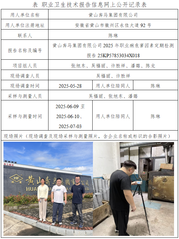 黃山奔馬集團有限公司2025年職業(yè)病危害因素定期檢測報告