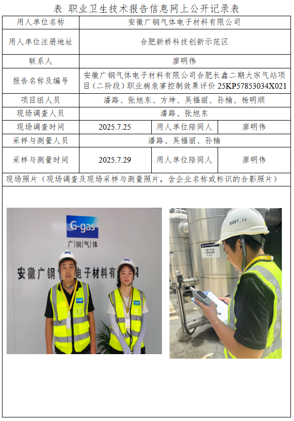 安徽廣鋼氣體電子材料有限公司合肥長(zhǎng)鑫二期大宗氣站項(xiàng)目(二階段)職業(yè)病危害控制效果評(píng)價(jià)報(bào)告