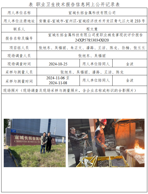 宣城長拓金屬科技有限公司度職業(yè)病危害現(xiàn)狀評價報告
