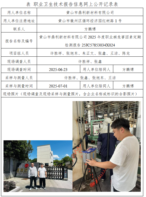 黃山市鼎利新材料有限公司2025年度職業(yè)病危害因素定期檢測(cè)報(bào)告