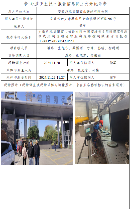 安徽應(yīng)流集團(tuán)霍山鑄造有限公司高端裝備用精密零件近凈成形制造項(xiàng)目職業(yè)病危害控制效果評(píng)價(jià)報(bào)告