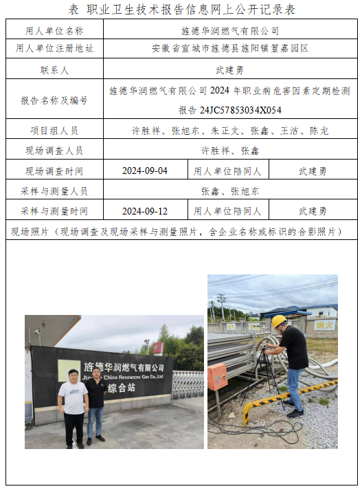 旌德華潤燃氣有限公司2024年職業(yè)病危害因素定期檢測報告