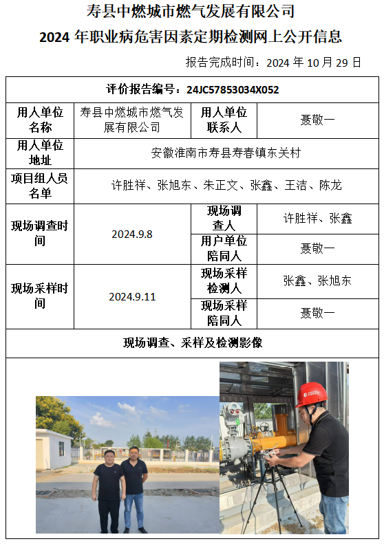 壽縣中燃城市燃?xì)獍l(fā)展有限公司 2024年職業(yè)病危害因素定期檢測(cè)報(bào)告